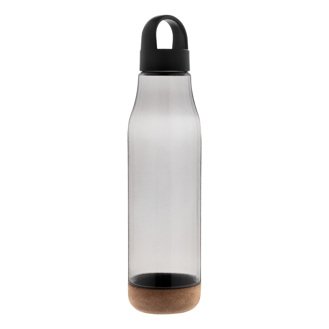 Flasche aus RPET mit Boden aus natürlichem Kork und Tragedeckel aus PP Kunststoff. Füllmenge: 720 ml. Nicht geeignet für kohlensäurehaltige Getränke.