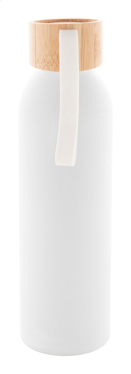 Flasche aus recyceltem Aluminium mit Bambus-Deckel und farblich abgestimmten Silikon-Trageschlaufe. Füllmenge: 600 ml.
