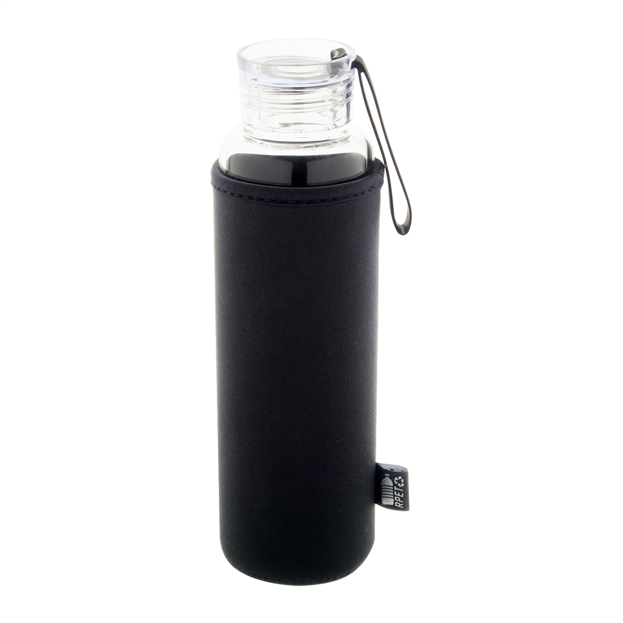 Flasche aus recyceltem Glas mit Deckel aus PS Kunststoff, Silikon-Trageschlaufe und Neoprenüberzug. Füllmenge: 550 ml. Nicht geeignet für kohlensäurehaltige Getränke.