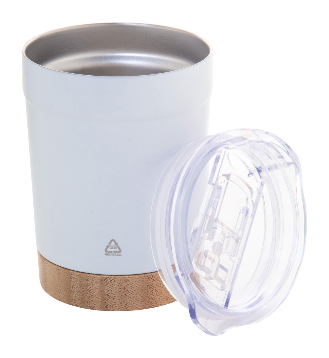 Doppelwandiger Vakuum-Thermobecher aus recycletem Edelstahl mit Bambusboden und Trinkdeckel aus AS Kunststoff. Füllmenge: 300 ml.