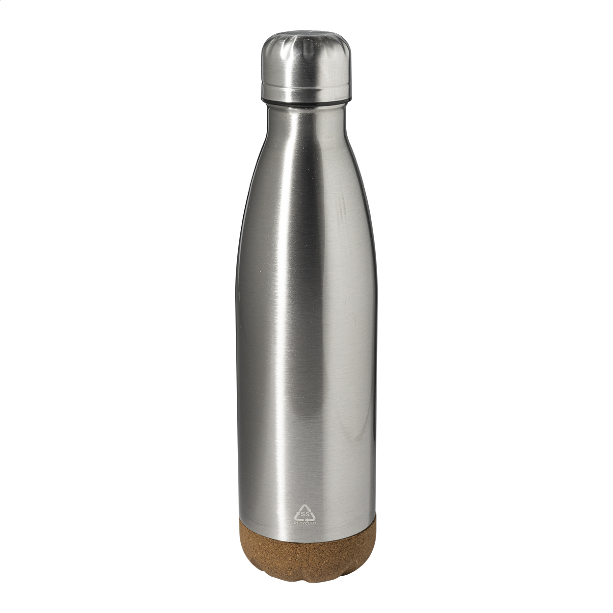 Doppelwandige vakuumisolierte Flasche aus recyceltem Edelstahl mit Boden aus Naturkork. Füllmenge: 500 ml.