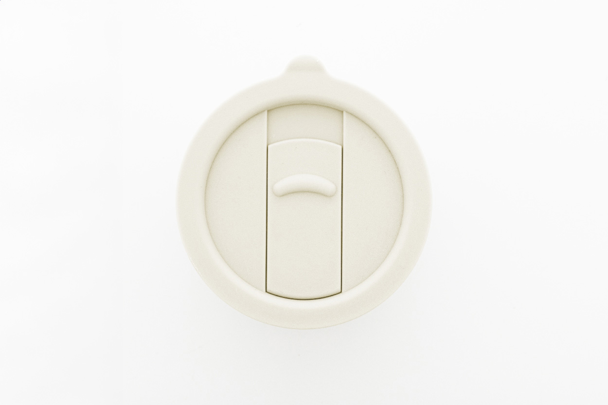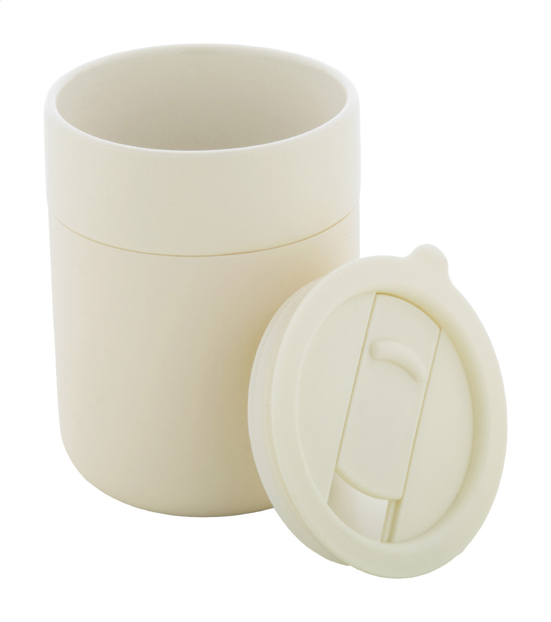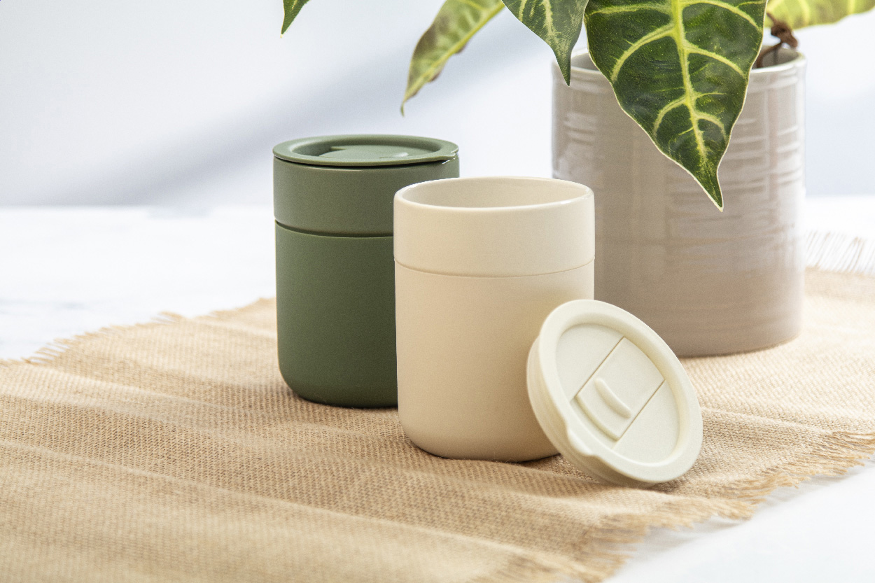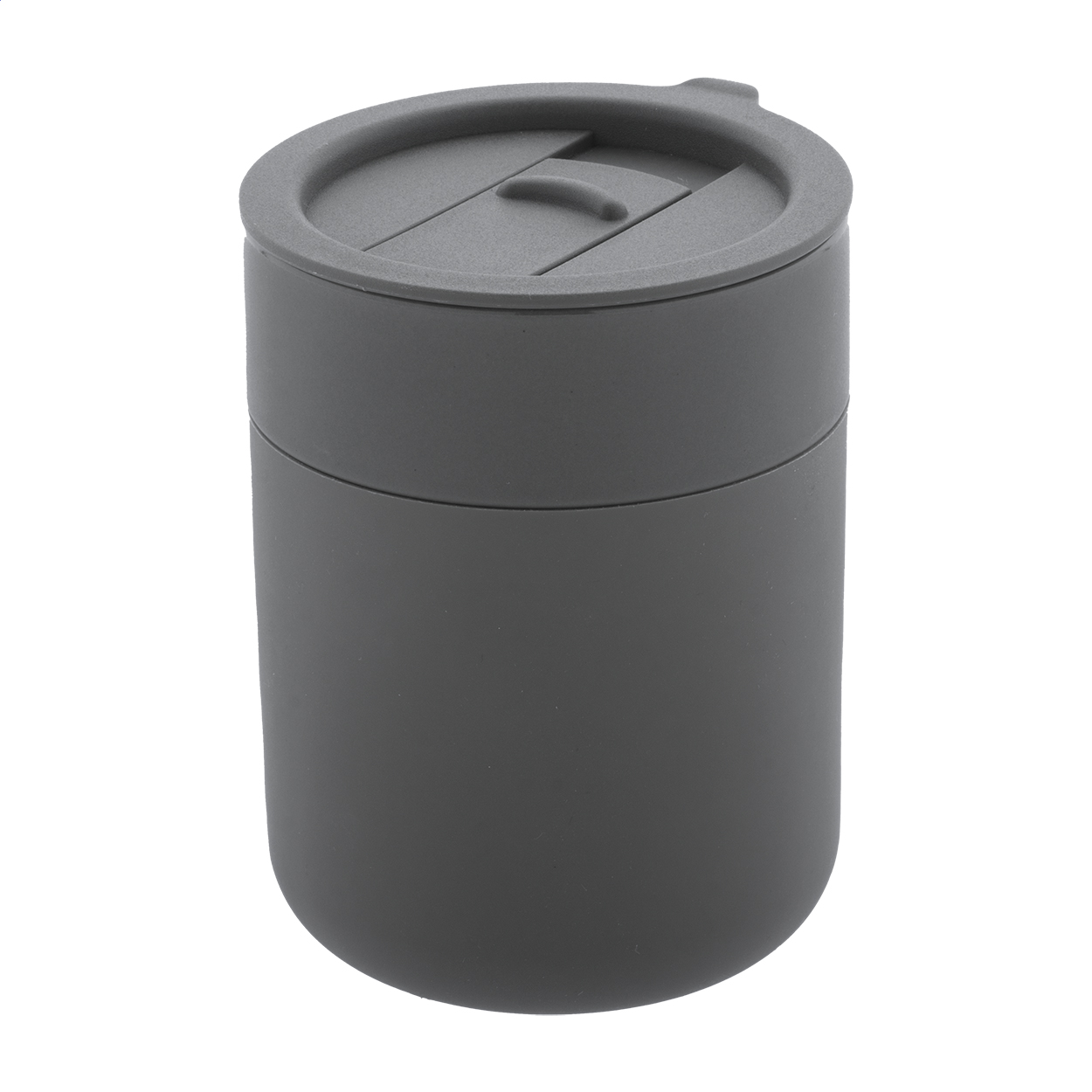 Reisebecher aus Keramik mit Silikonummantelung mit Trinkdeckel aus PP Kunststoff. Füllmenge: 300 ml.