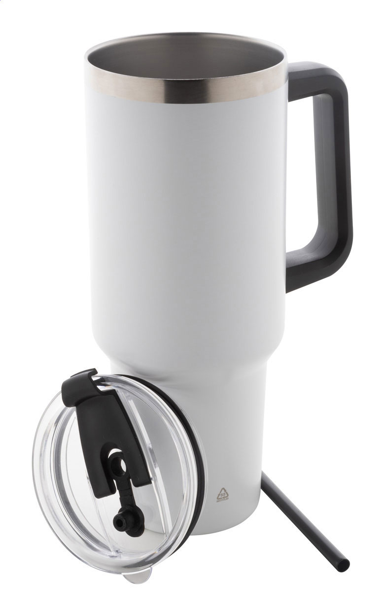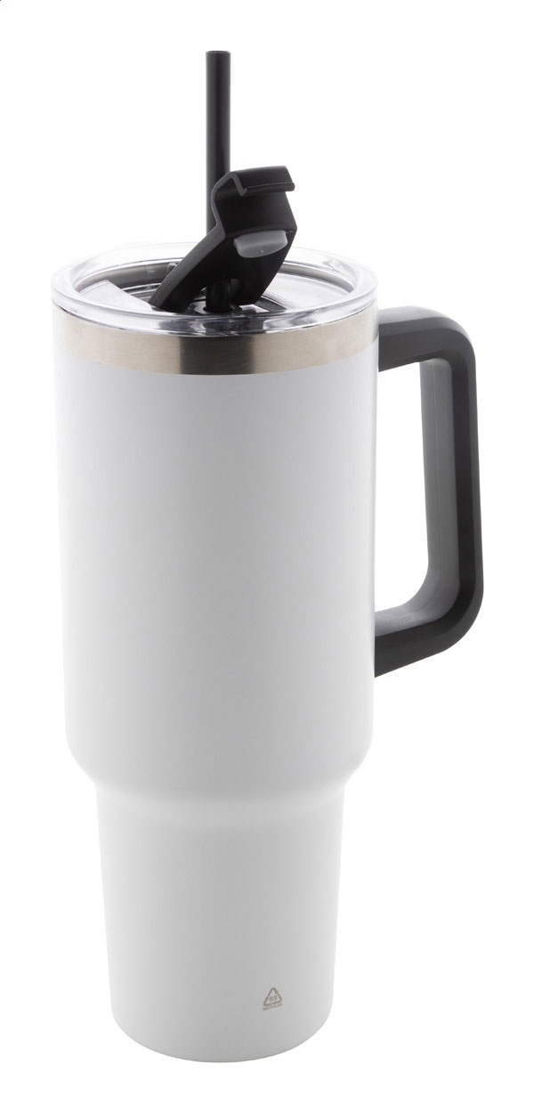 Doppelwandiger, vakuumisolierter Thermobecher aus recyceltem Edelstahl mit PS-Trinkdeckel und PP-Strohhalm. Füllmenge: 1200 ml.