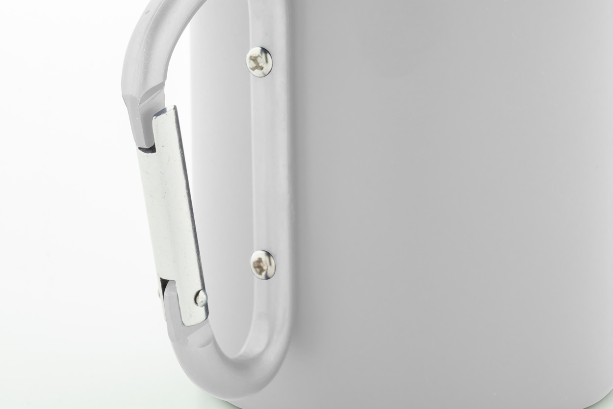Doppelwandiger Thermobecher aus recyceltem Edelstahl mit farblich passendem Karabinergriff aus recyceltem Aluminium. Füllmenge: 300 ml. Einzeln in Kraftpapierbox.