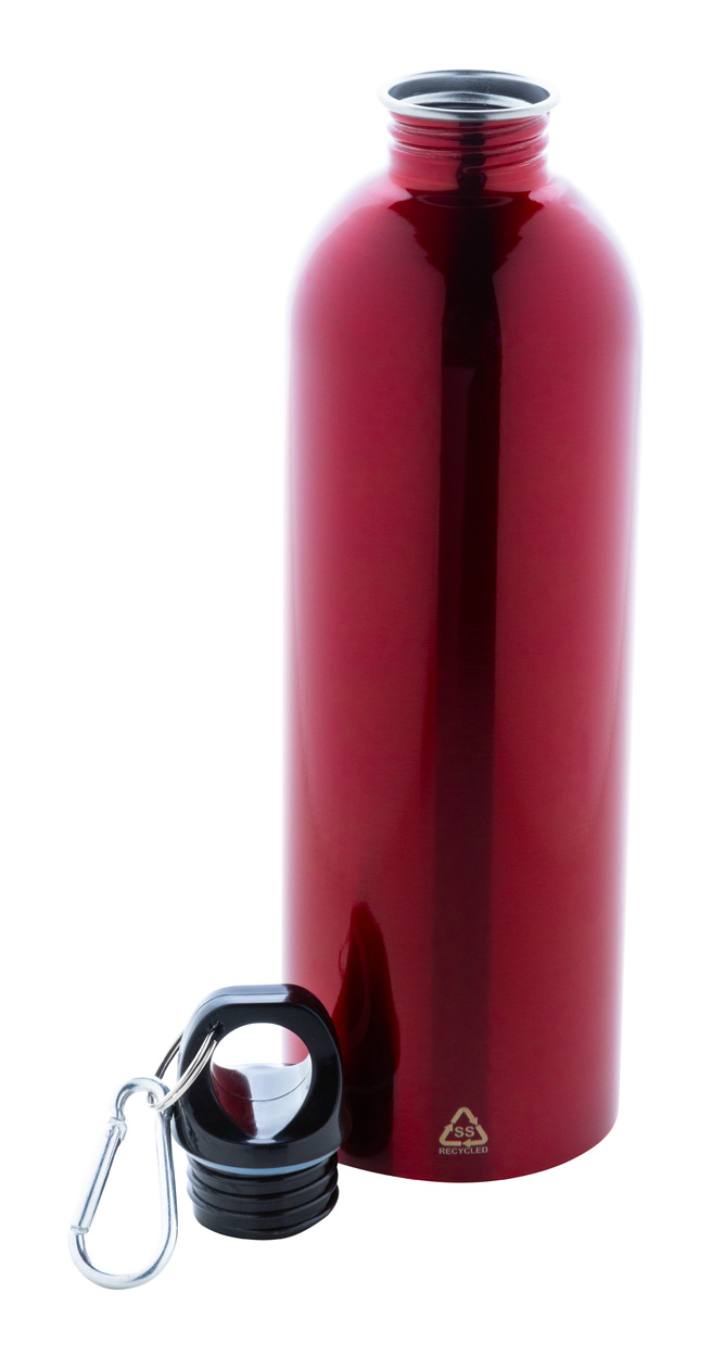 Recycelte Edelstahlflasche mit Aluminiumkarabiner. Füllmenge: 750 ml.