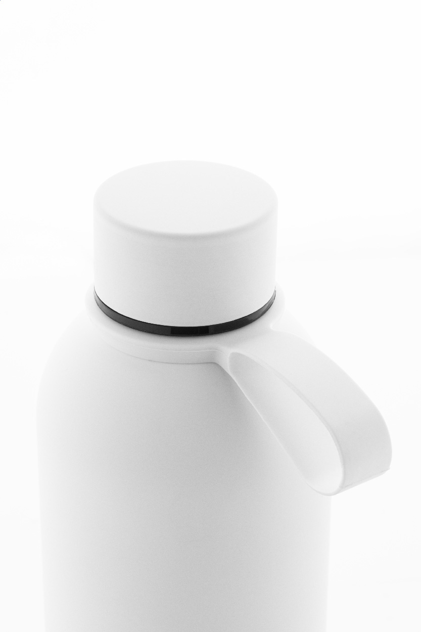 Doppelwandige, vakuumisolierte Flasche aus recyceltem Edelstahl mit gummierter Oberfläche und Tragegriff aus Silikon. Füllmenge: 500 ml.