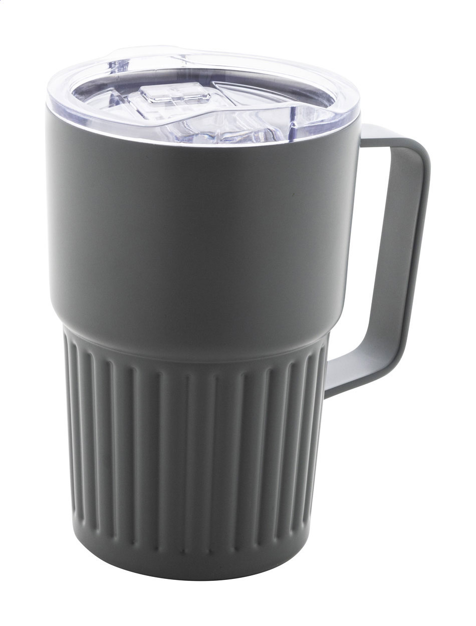 Doppelwandiger, isolierter Thermobecher aus recyceltem Edelstahl mit Trinkdeckel aus ABS-Kunststoff. Füllmenge: 470 ml.
