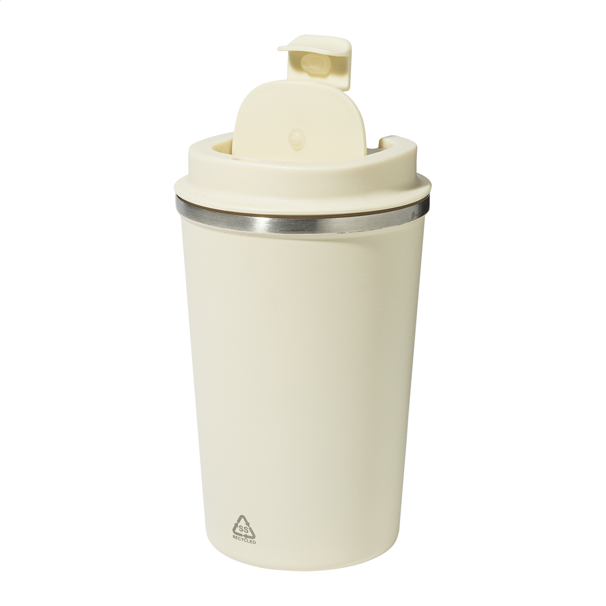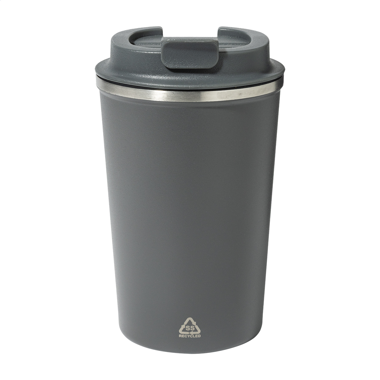 Doppelwandiger, Isolierbecher aus recyceltem Edelstahl mit PP-Kunststoffaußenseite und Trinkdeckel. Mit RPET-Griffschlaufe. Füllmenge: 350 ml.