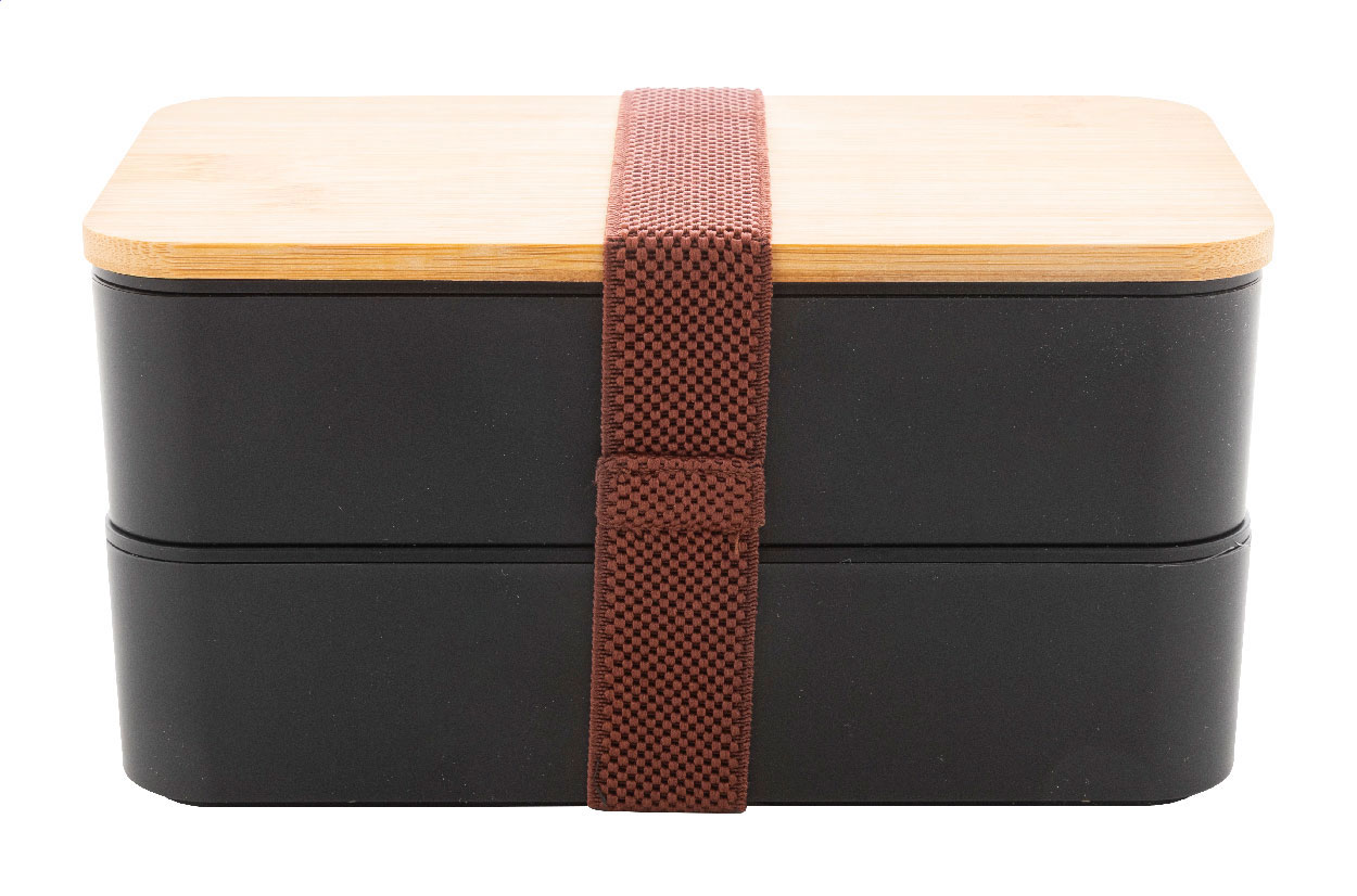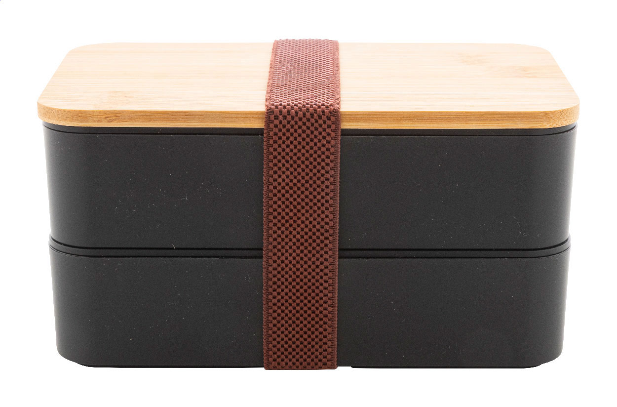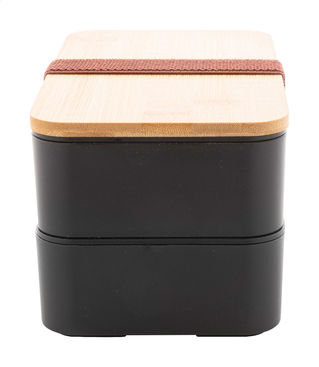 Lunchbox aus PP-Kunststoff mit Besteckset (Messer, Gabel und Löffel), Bambusdeckel und Elastikband. Mit 2 Abteilen von je 700 ml.