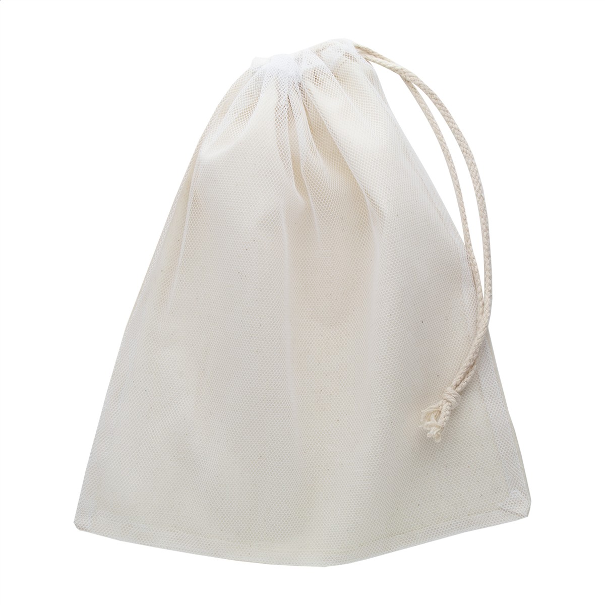 Wiederverwendbarer Obst-/Gemüsebeutel aus Baumwolle (95g/m²) mit Polyesternetz auf der Vorderseite und Zugkordelverschluss.