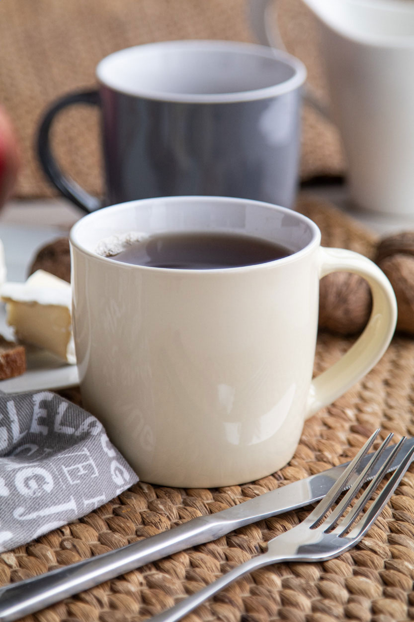 Hochwertige, farbige Keramiktasse mit weißer Innenseite. Einzeln in Kraftpapierbox. Füllmenge: 370 ml.